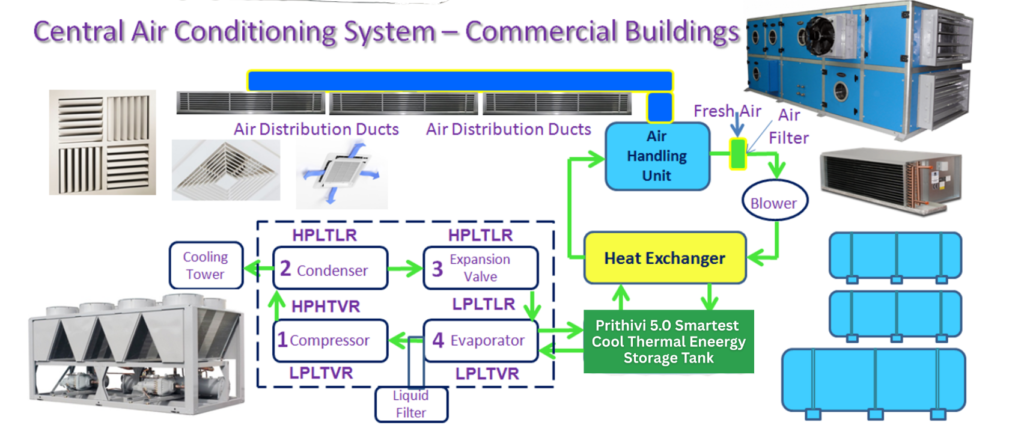 The most significant contributor to air conditioning power savings in PGC 5.0 with CTES + MPC systems comes from Demand Management. The system produces and stores cooling during off-peak periods (typically night time) when electricity demand and tariffs are lower in few countries like India (Peak hours power tariffs are 20 – 40% higher than the normal power tariffs), and discharges the stored cooling during peak demand hours. This approach helps reduce peak electrical demand while maintaining effective cooling performance because of effective and efficient storage systems.